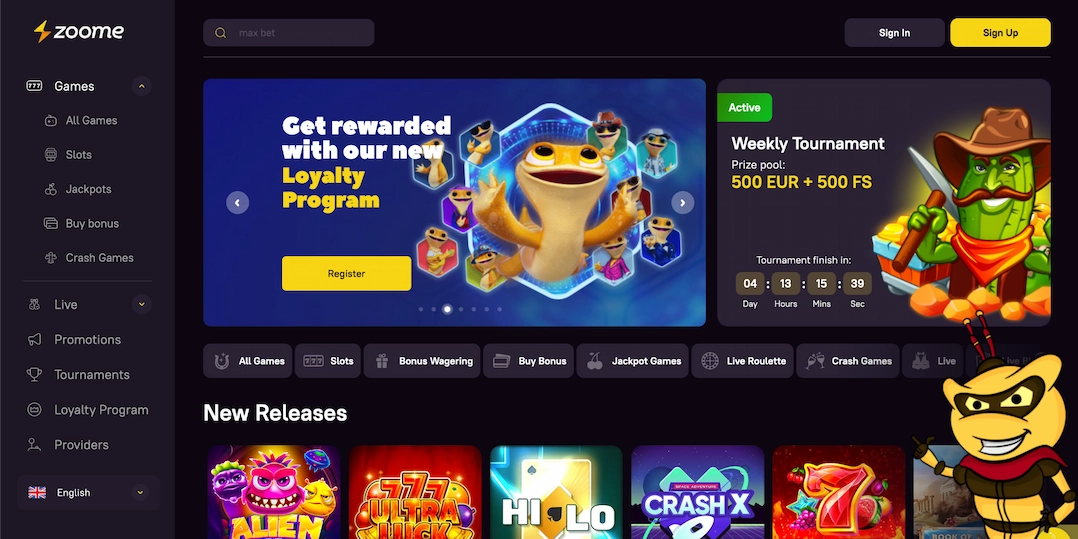 Zoome Casino provides a welcome package of up to A$2,500 and 250 free spins. Licensed by Curacao, Zoome supports PayID, boasts over 4,000 pokie titles, and offers seamless mobile compatibility.